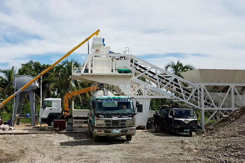 Une chargeuse sur pneus alimentera les 4 trémies différentes pour des agrégats de différentes tailles, puis les agrégats et le sable seront pesés par les cellules de charge, et le ciment provient du silo à ciment par le convoyeur à vis, l'eau est fournie par la pompe à eau sera également pesés par différentes cellules de charge, puis tous ces matériaux seront introduits dans le mélangeur pour être mélangés. Après le malaxage, le béton sera déversé dans le camion malaxeur à béton. Tous les processus de pesage, de mélange et de déchargement sont contrôlés automatiquement par le logiciel.
