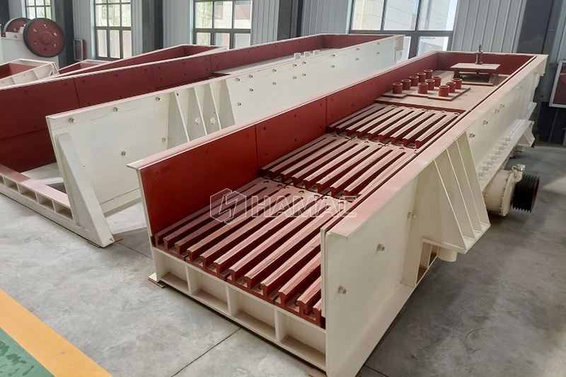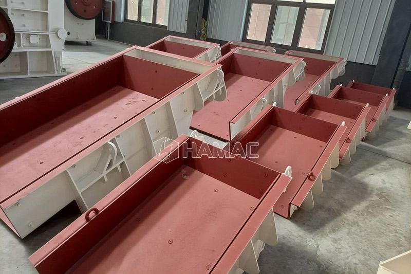 L'alimentateur vibrant est composé d'une mangeoire, d'un excitateur de vibrations, d'un support à ressort et d'un dispositif de transmission. La source de vibrations de l'alimentation vibrante du corps d'auge est un excitateur de vibrations ou un moteur. L'excitateur de vibrations est composé de deux arbres excentriques (principal et passif) et d'une paire d'engrenages. Le moteur entraîne l'arbre d'entraînement à travers la courroie trapézoïdale, puis l'engrenage sur l'arbre d'entraînement s'engrène L'arbre excentrique tourne et les arbres principal et excentrique tournent dans des directions opposées en même temps, ce qui fait vibrer le corps de l'auge, de sorte que le matériau s'écoule en continu et atteint l'objectif d'alimentation du matériau.